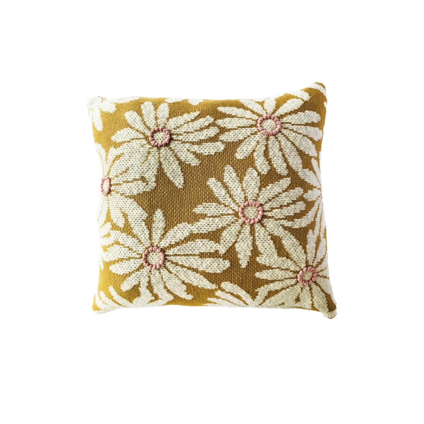Yellow Knit Pillow with Floral Embroidery