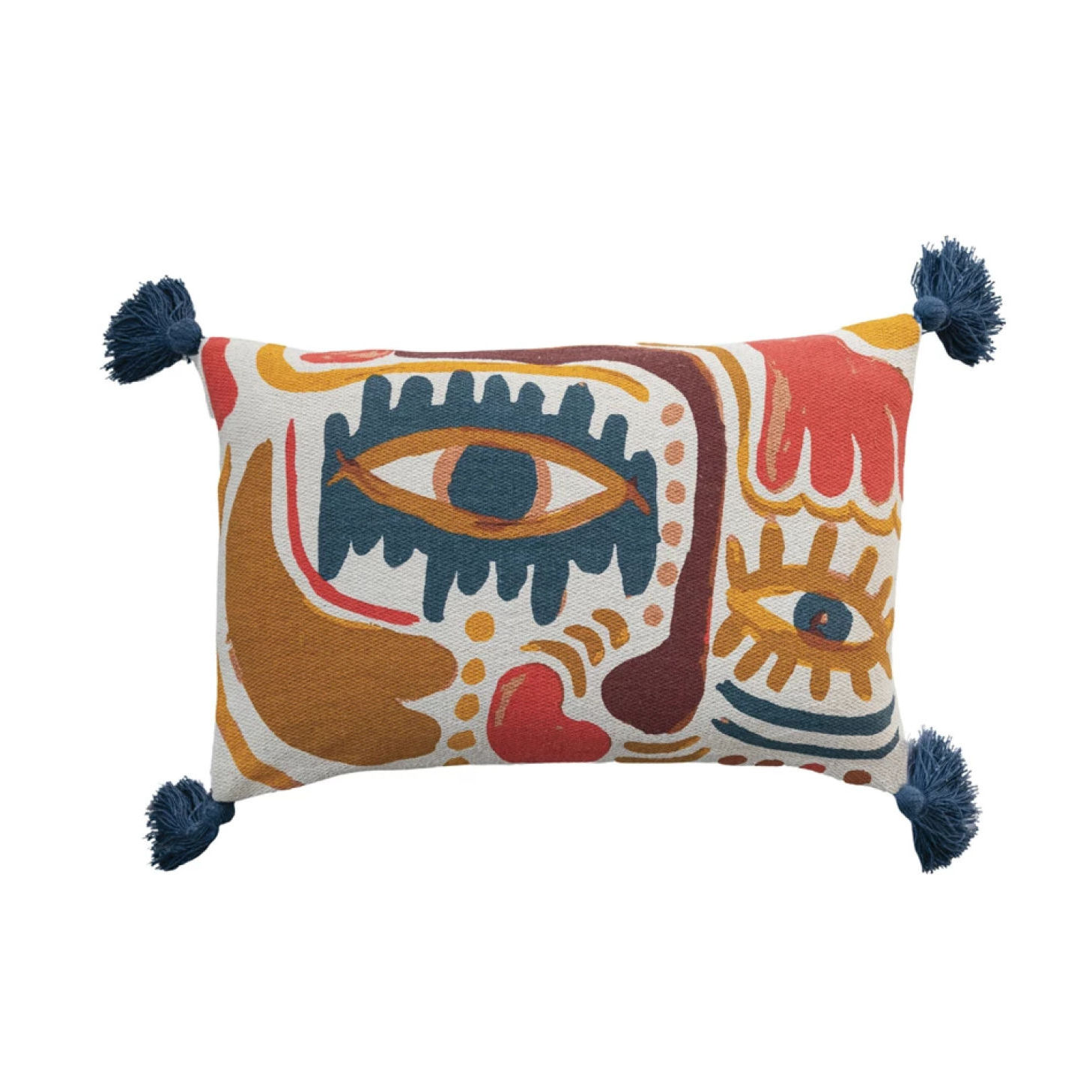 Multicolor Recycled Cotton Blend Printed Lumbar Pillow with Abstract Face Pattern & Tassels