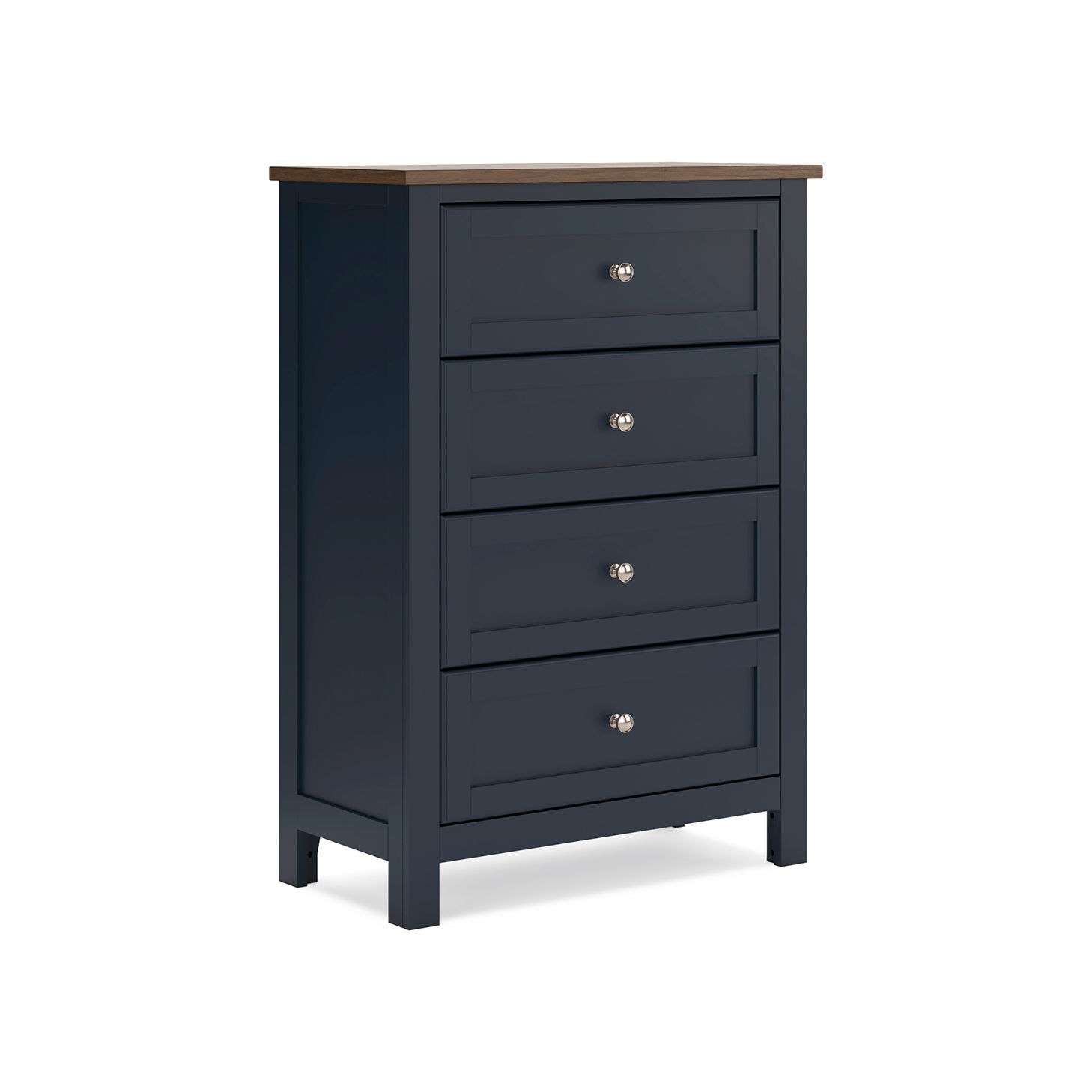 Add homespun charm to your restful retreat. A modern take on a timeless silhouette, this chest of drawers pairs a dark slate blue finish with a light brown top. Drawer fronts and legs in a classic Shaker style bring an air of beautiful simplicity to the bedroom. Whether it's part of a charmingly curated guest suite or a casually carefree kids room, this chest is a welcome addition.