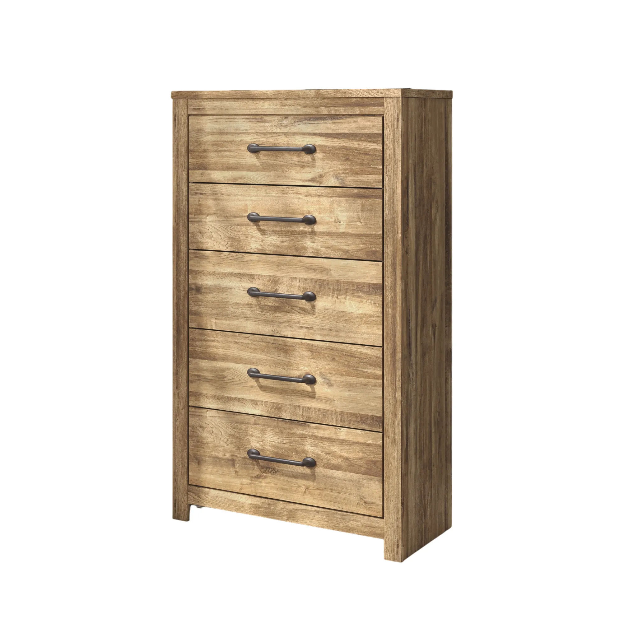 Approachable in character, this chest of drawers embodies fresh style that inspires. Its warm finish and replicated oak grain invite with homey charm, while details like sleek drawer pulls lend a contemporary attitude. From urban chic to modern farmhouse, this versatile piece seamlessly reflects your eye for design.