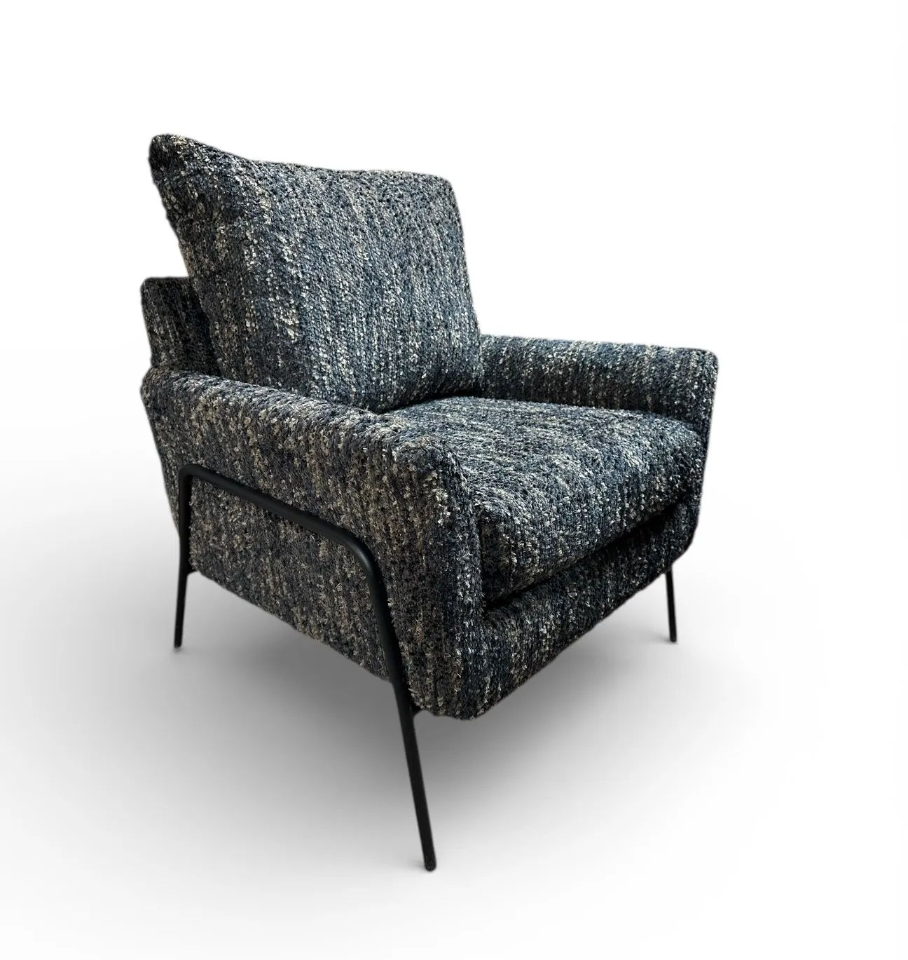 The Morely accent chair combines sleek modern design with versatility. Its decorative black metal frame supports a contemprary design that features reversible seat and back cushions, offering both style and comfort. A spacious seat is framed by modern flared arms.