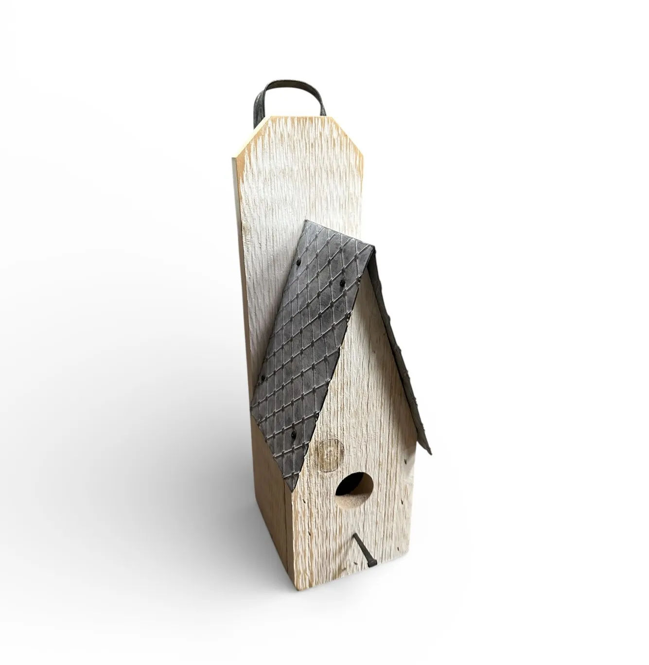 White Wash Birdhouse with Metal Roof and Hanging Handle