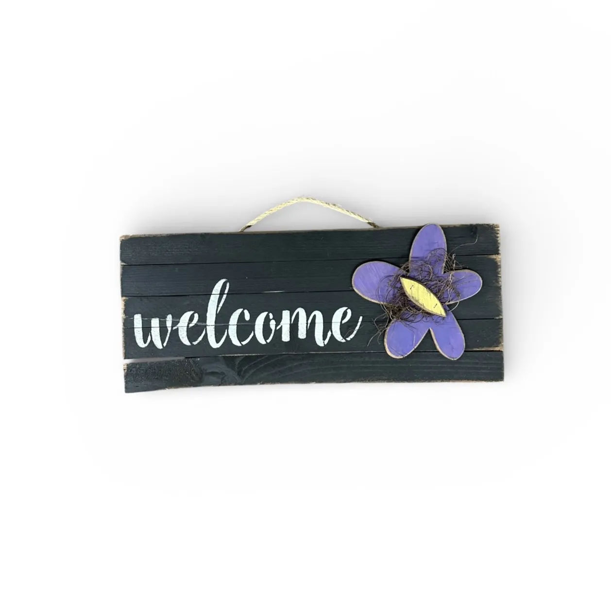 Dark Painted Rustic "Welcome" Sign with Blue Flower