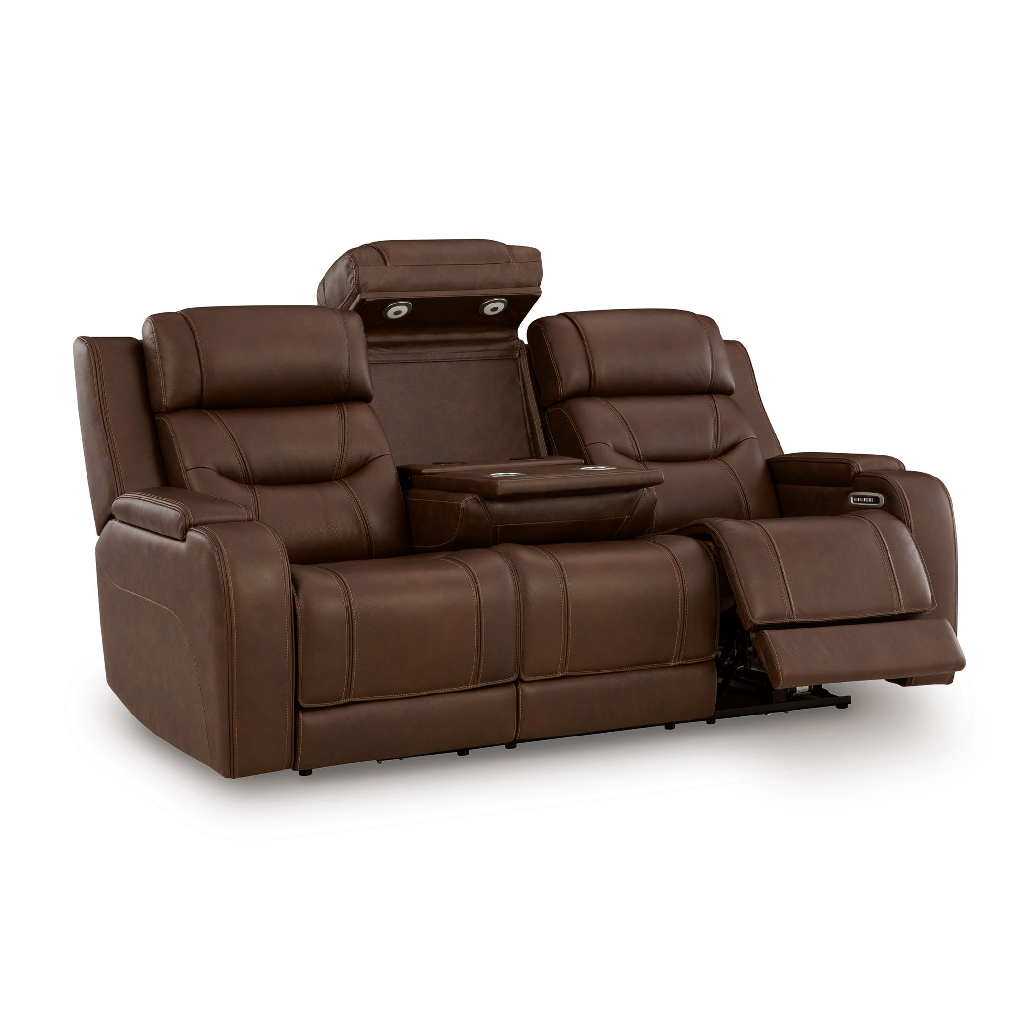 Brown Leather Power Reclining Sofa with Console and Built-in Audio