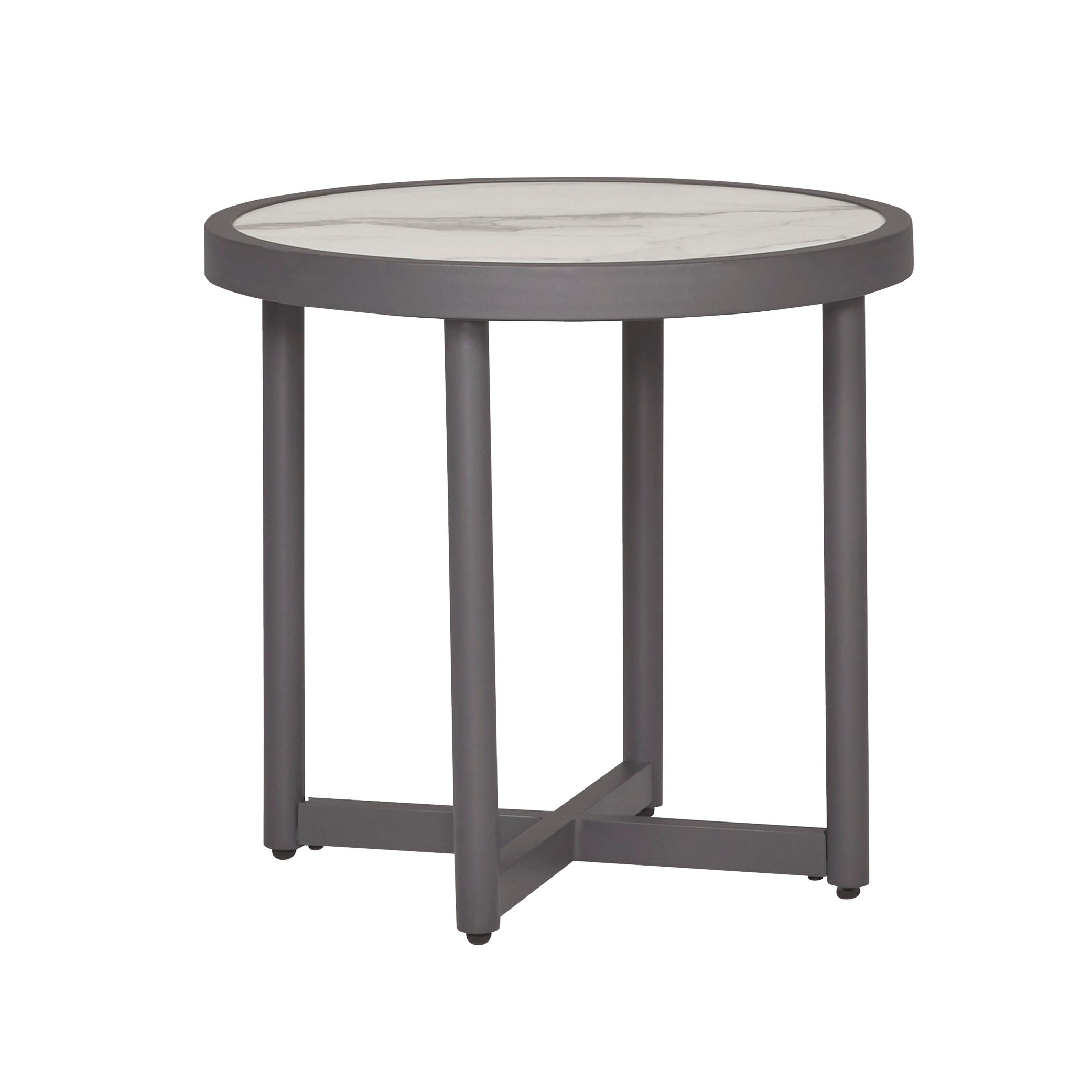 A refined marriage of style and durability, this outdoor end table adds contemporary flair to your porch or patio. Shades of gray and a luxe marble look on top lend a versatile, neutral appeal. And this table is built to last, thanks to its rust-resistant aluminum construction.