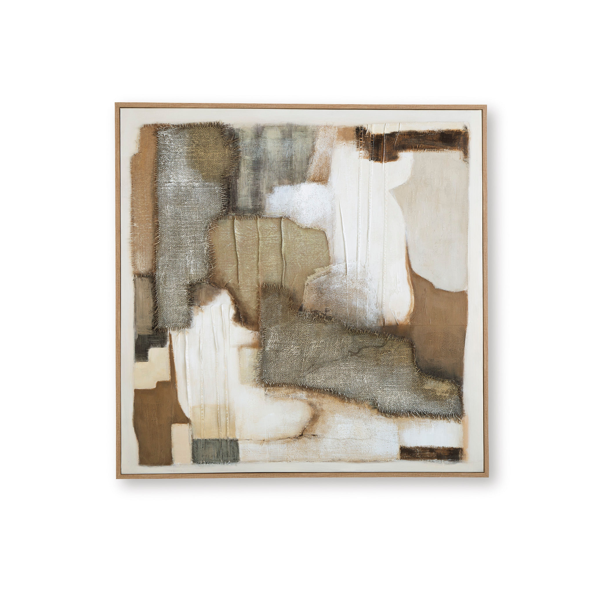 This wall art brings a fresh and comforting feel to modern spaces. Flowing brushstrokes in serene shades of tan, brown, gray, and ivory create an abstract design full of organic movement. Fabric embellishments are layered with hand painted details. And when you need a change in perspective, this piece can hang four ways to switch up its styling.
